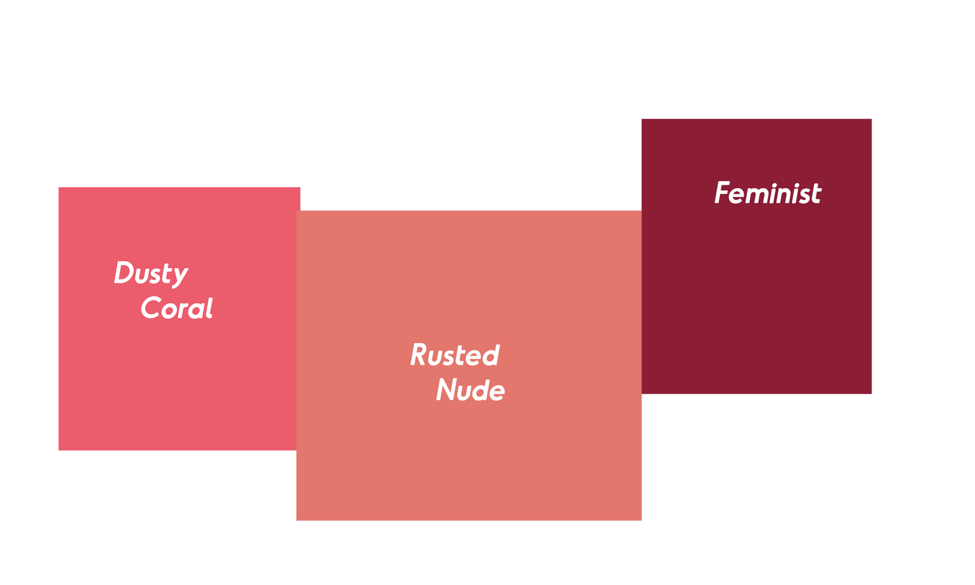Feminist, Rusted Nude und Dusty Coral sind etwas höher pigmentierte Farben im Vergleich zu den ersten beiden, siehe Farbpalette.
