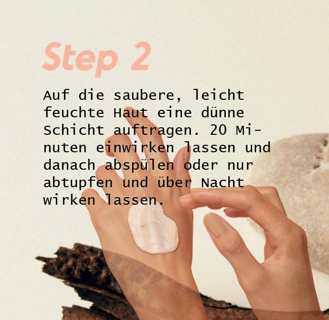 Anwendung: In die gereinigte Haut dünn einmassieren (Augenbrauen und Augenpartie aussparen) und anschließend 15 - 25 Minuten einwirken lassen. Danach mit warmen Wasser abspülen oder alternativ nur abtupfen.