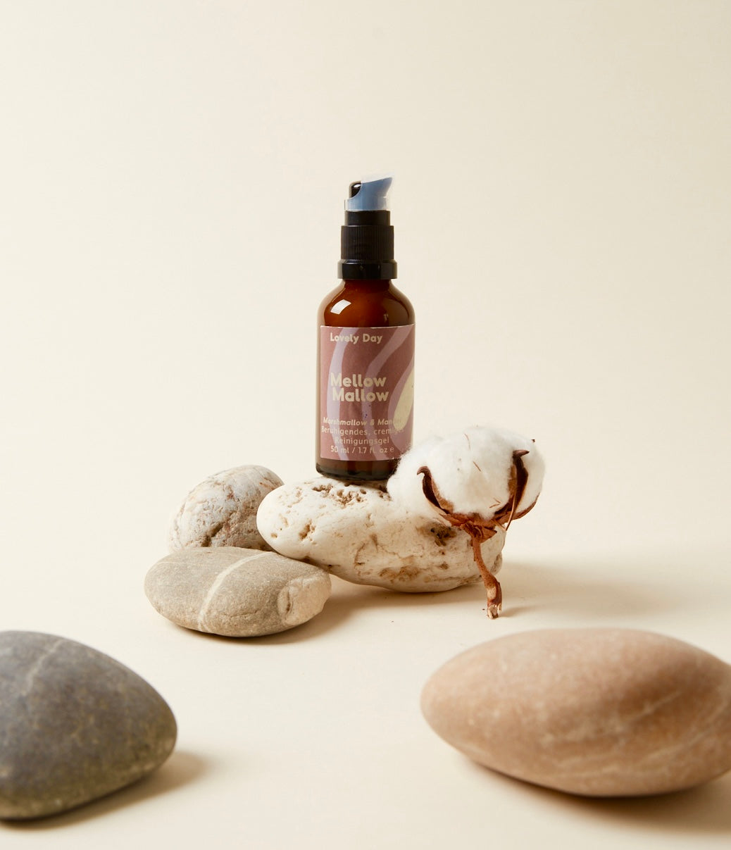 Das Original mit unserem frisch hergestellten Marshmallow Schleim! Unser Mellow Mallow Creamy Cleansing Gel ist ein Hybrid aus einer Reinigungsmilch und einem Reinigungsgel. Wir haben uns das Beste aus beiden Welten gewünscht: Eine cremige Textur, die die Haut nicht austrocknet aber keinen Film hinterlässt und die Reinigungsleistung eines gut reinigenden Gels. Dazu haben wir nährende,lokal bezogene Öle wie Pflaumenkern- und Sonnenblumenkernöl in ein cremiges Gelgerüst aus Aloe Vera, Marshmallowextrakt und Hyaluronsäure eingebettet und zur Reinigung milde Zuckertenside hinzugefügt. Unser hausgemachter Marshmallowextrakt entwickelt sich bei Kontakt mit Wasser zusammen mit Panthenol zu einem beruhigenden Gel, dass deine Haut während der Reinigung wie ein Schutzkissen vor Austrocknung schützt und beruhigt. Was bleibt ist streichelzarte, saubere Haut die perfekt auf die weitere Pflege vorbereitet ist.Frei von Parfum, Farbstoffen und Alkohol.Vermische 1-3 Pumphübe des Produktes mit etwas Wasser in deinen Händen und massiere es danach in dein Gesicht ein. Danach wäschst du dein Gesicht gründlich mit lauwarmen Wasser. Unser Creamy Cleansing Gel entfernt leichtes bis moderates Make-Up. Es reicht, dein Gesicht abends zu waschen! Morgens empfehlen wir die Reinigung mit lauwarmem Wasser und unserem Toner. Wenn du kein Make Up trägst, dann reicht auch ein Pumphub vermischt mit Wasser um dein ganzes Gesicht und Dekolleté vom Alltagsschmutz zu befreien. Generell gilt: So viel wie nötig, so wenig wie möglich. Wer super sensible Haut hat, kann alternativ das Mellow Mallow Spray als Toner benutzen, auf ein Wattepad sprühen und die Haut damit abtupfen.